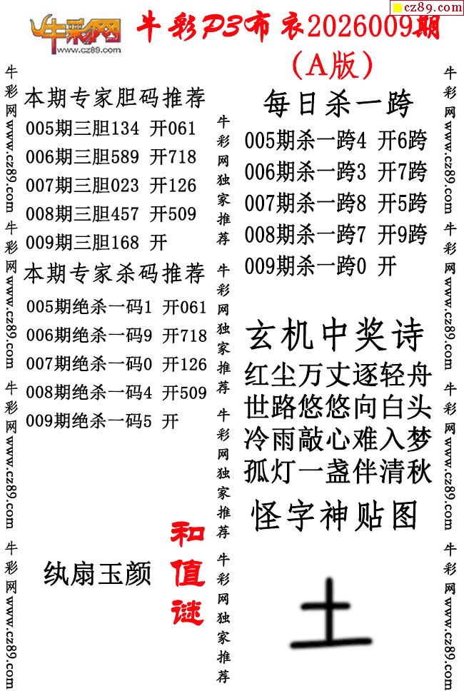 牛彩P3布衣26年009期AB版图谜(精华版)-3D试机号_今天福彩3D开机号和试机号查询_排列三开机号和试机号